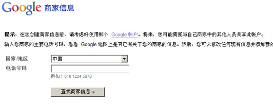 3.選企業(yè)所在的國家和填入企業(yè)主要電話號碼,建議使用手機號碼,方便google驗證,填完點擊“查找商家信息”按鈕。